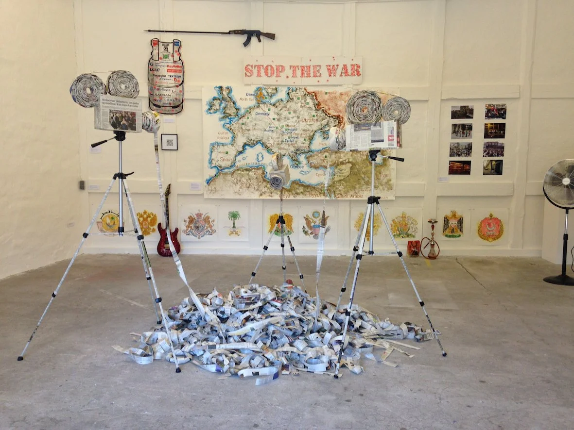 Spices, sand, salt, paper, ink, newspaper, bullet caps, shisha, toy gun, photograph, guitar